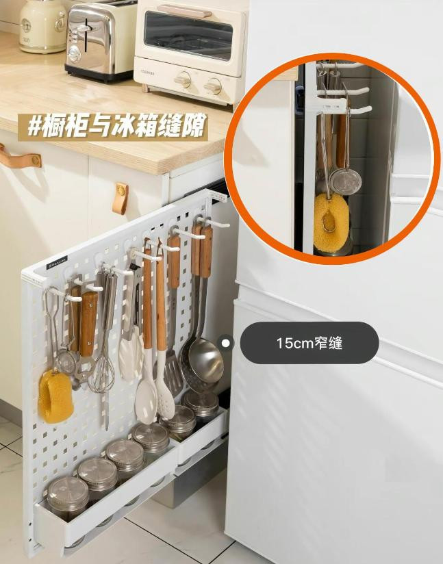 冰箱和台面之间剩下的15厘米,也被他装了侧挂洞洞板。