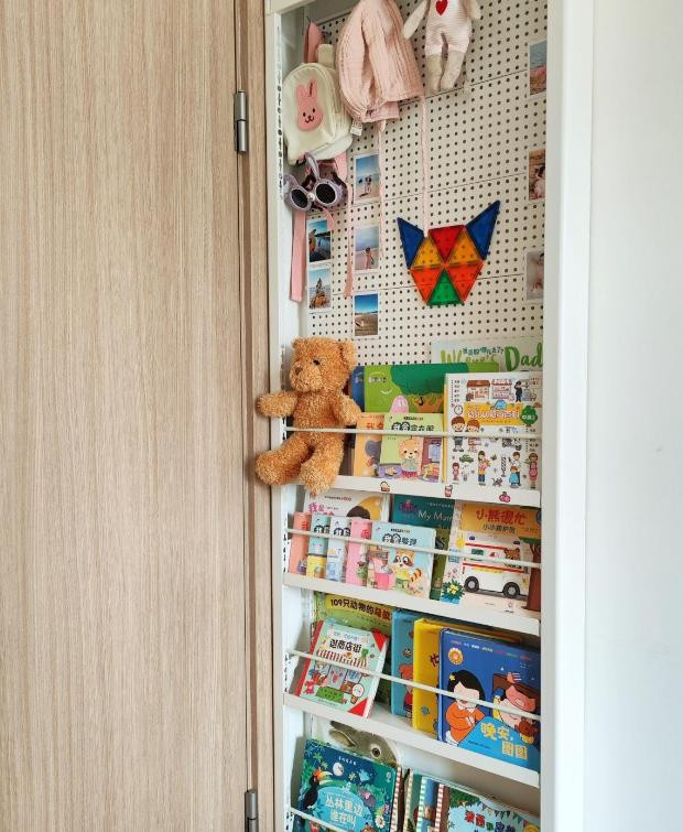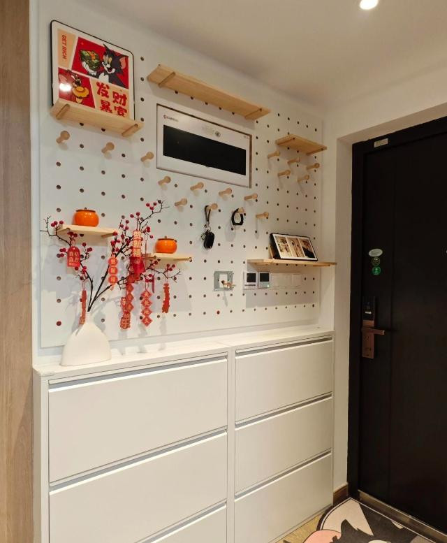 上方洞洞板还能挂包、帽子,甚至贴照片。