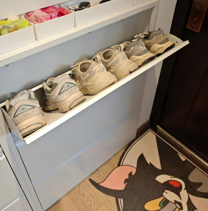 他量了好几次尺寸,最后选了超薄金属翻斗鞋柜,深度只有12厘米。